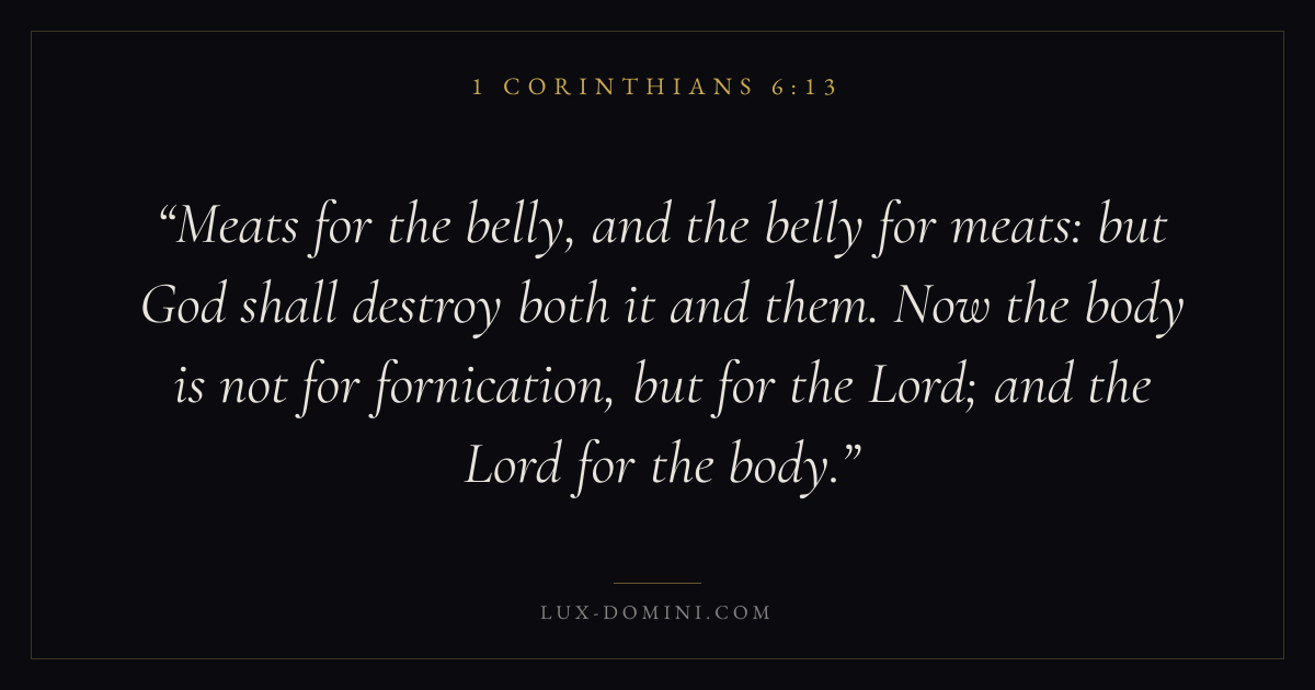 Meats for the belly, and the belly for meats: but God shall destroy both it and them. Now the body is not for fornication, but for the Lord; and the Lord for the body.