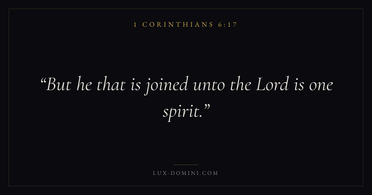 Books / 1 Corinthians / Chapter 6 / Verse 17 ← 1 Corinthians 6:16 1 Corinthians 6:17 1 Corinthians 6:18 → But he that is joined unto the Lord is one spirit. Download verse card Share on Twitter Share on Facebook Pin it ✦ Key themes LoveEternal lifeThe crossChurch order Read with 1 Corinthians 6:151 Corinthians 6:16John 3:161 Corinthians 13:4 Related topics Bible verses about loveBible verses about eternal life ✦ 1 Corinthians Chapter 6 verses V. 1 V. 2 V. 3 V. 4 V. 5 V. 6 V. 7 V. 8 V. 9 V. 10 V. 11 V. 12 V. 13 V. 14 V. 15 V. 16 V. 17 V. 18 V. 19 V. 20