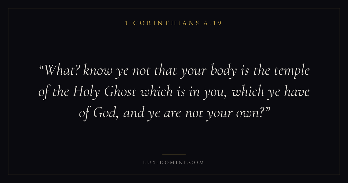 What? know ye not that your body is the temple of the Holy Ghost which is in you, which ye have of God, and ye are not your own?