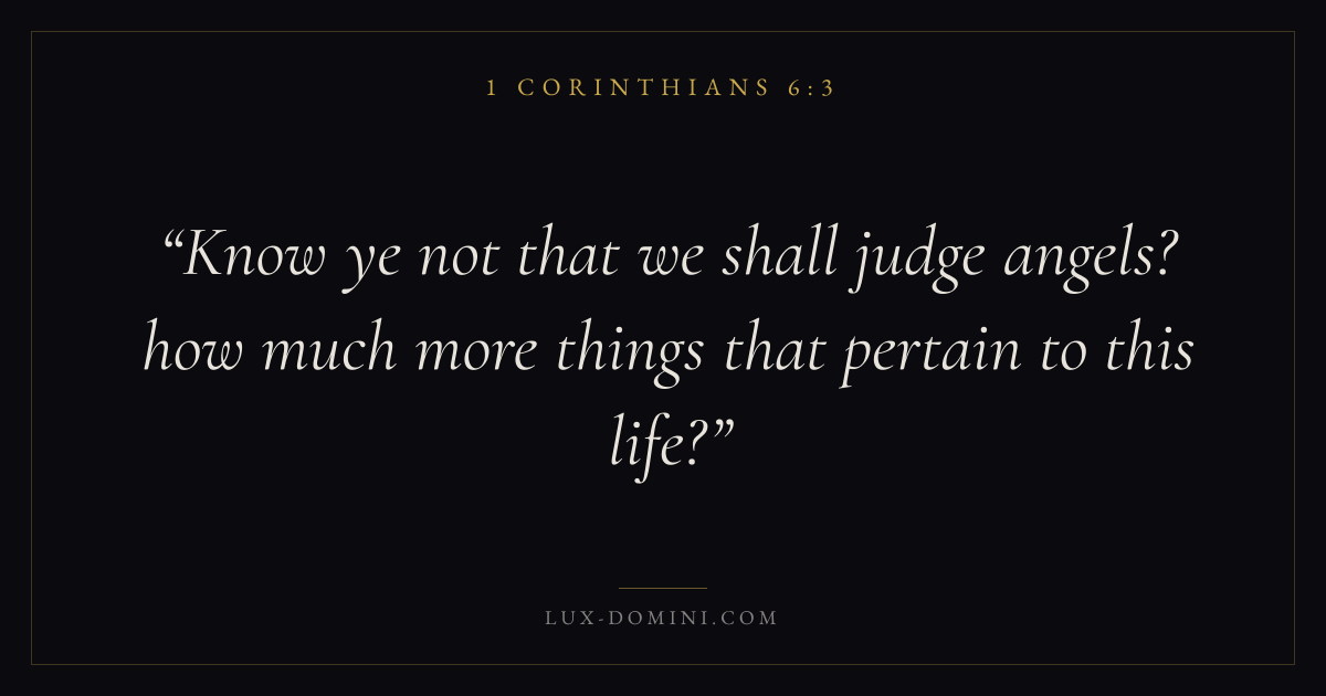Books / 1 Corinthians / Chapter 6 / Verse 3 ← 1 Corinthians 6:2 1 Corinthians 6:3 1 Corinthians 6:4 → Know ye not that we shall judge angels? how much more things that pertain to this life? Download verse card Share on Twitter Share on Facebook Pin it ✦ Key themes LoveJustice and mercyEternal lifeThe cross Read with 1 Corinthians 6:4John 3:161 Corinthians 13:4Micah 6:8 Related topics Bible verses about loveBible verses about justice and mercyBible verses about eternal life ✦ 1 Corinthians Chapter 6 verses V. 1 V. 2 V. 3 V. 4 V. 5 V. 6 V. 7 V. 8 V. 9 V. 10 V. 11 V. 12 V. 13 V. 14 V. 15 V. 16 V. 17 V. 18 V. 19 V. 20