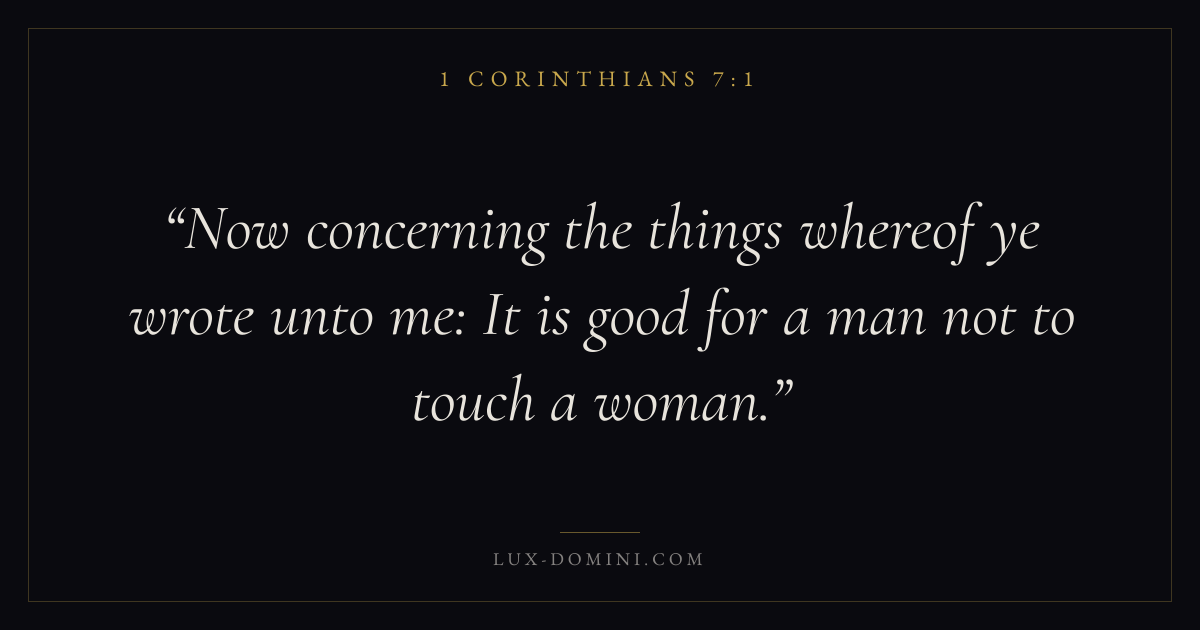 Books / 1 Corinthians / Chapter 7 / Verse 1 ← 1 Corinthians 6:20 1 Corinthians 7:1 1 Corinthians 7:2 → Now concerning the things whereof ye wrote unto me: It is good for a man not to touch a woman. Download verse card Share on Twitter Share on Facebook Pin it ✦ Key themes LoveWisdomEternal lifeThe cross Read with 1 Corinthians 7:2John 3:161 Corinthians 13:4Proverbs 1:7 Related topics Bible verses about loveBible verses about wisdomBible verses about eternal life ✦ 1 Corinthians Chapter 7 verses V. 1 V. 2 V. 3 V. 4 V. 5 V. 6 V. 7 V. 8 V. 9 V. 10 V. 11 V. 12 V. 13 V. 14 V. 15 V. 16 V. 17 V. 18 V. 19 V. 20 V. 21 V. 22 V. 23 V. 24 V. 25 V. 26 V. 27 V. 28 V. 29 V. 30 V. 31 V. 32 V. 33 V. 34 V. 35 V. 36 V. 37 V. 38 V. 39 V. 40