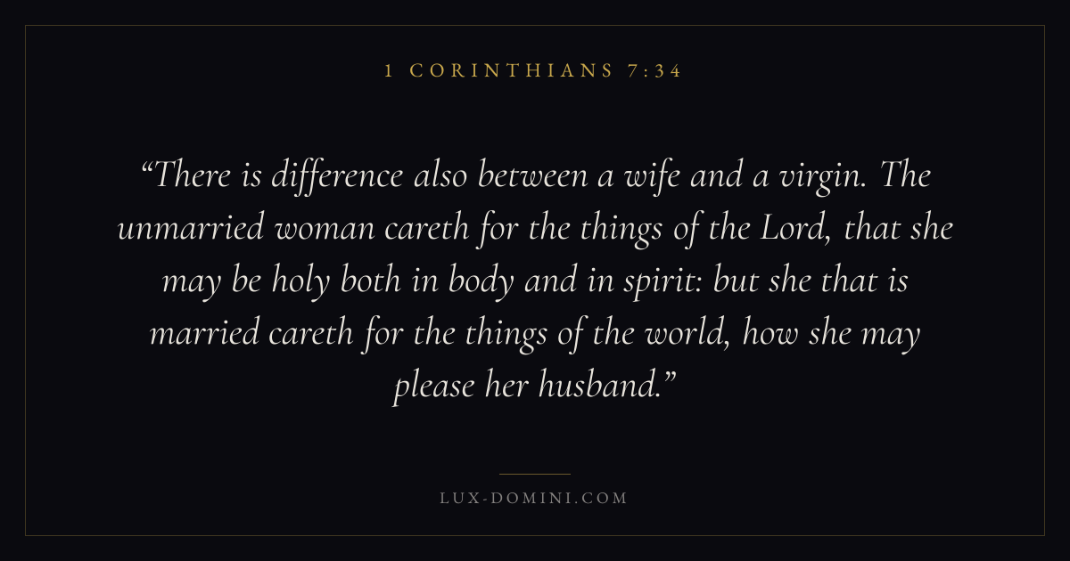 There is difference also between a wife and a virgin. The unmarried woman careth for the things of the Lord, that she may be holy both in body and in spirit: but she that is married careth for the things of the world, how she may please her husband.