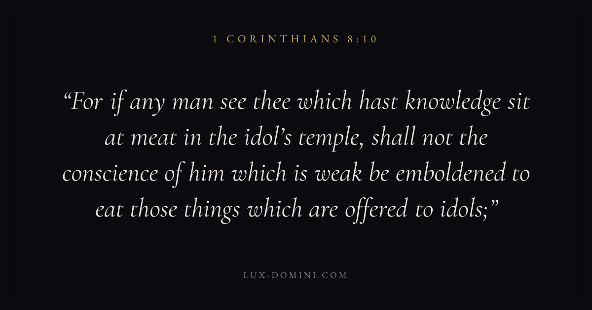 For if any man see thee which hast knowledge sit at meat in the idol’s temple, shall not the conscience of him which is weak be emboldened to eat those things which are offered to idols;