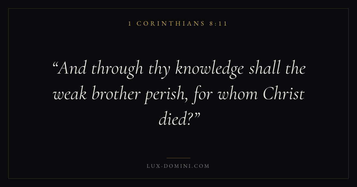 Books / 1 Corinthians / Chapter 8 / Verse 11 ← 1 Corinthians 8:10 1 Corinthians 8:11 1 Corinthians 8:12 → And through thy knowledge shall the weak brother perish, for whom Christ died? Download verse card Share on Twitter Share on Facebook Pin it ✦ Key themes LoveWisdomEternal lifeThe cross Read with 1 Corinthians 8:71 Corinthians 8:8John 3:161 Corinthians 13:4 Related topics Bible verses about loveBible verses about wisdomBible verses about eternal life ✦ 1 Corinthians Chapter 8 verses V. 1 V. 2 V. 3 V. 4 V. 5 V. 6 V. 7 V. 8 V. 9 V. 10 V. 11 V. 12 V. 13