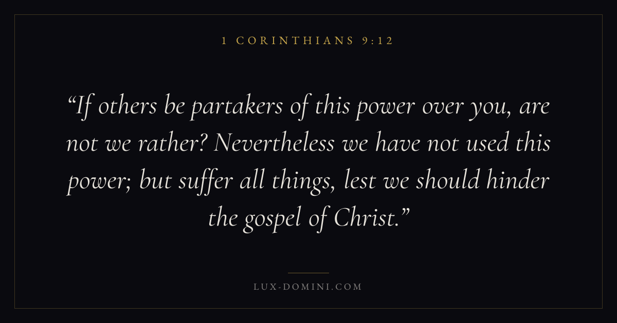 If others be partakers of this power over you, are not we rather? Nevertheless we have not used this power; but suffer all things, lest we should hinder the gospel of Christ.
