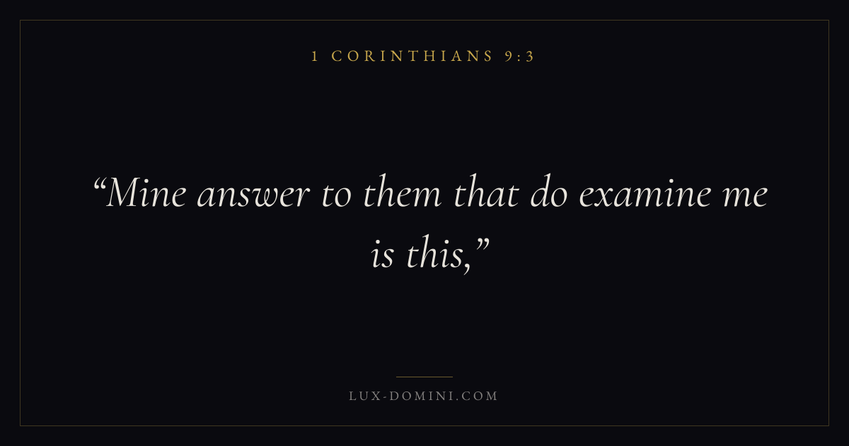 Books / 1 Corinthians / Chapter 9 / Verse 3 ← 1 Corinthians 9:2 1 Corinthians 9:3 1 Corinthians 9:4 → Mine answer to them that do examine me is this, Download verse card Share on Twitter Share on Facebook Pin it ✦ Key themes LoveEternal lifeThe crossChurch order Read with 1 Corinthians 9:4John 3:161 Corinthians 13:4John 17:3 Related topics Bible verses about loveBible verses about eternal life ✦ 1 Corinthians Chapter 9 verses V. 1 V. 2 V. 3 V. 4 V. 5 V. 6 V. 7 V. 8 V. 9 V. 10 V. 11 V. 12 V. 13 V. 14 V. 15 V. 16 V. 17 V. 18 V. 19 V. 20 V. 21 V. 22 V. 23 V. 24 V. 25 V. 26 V. 27