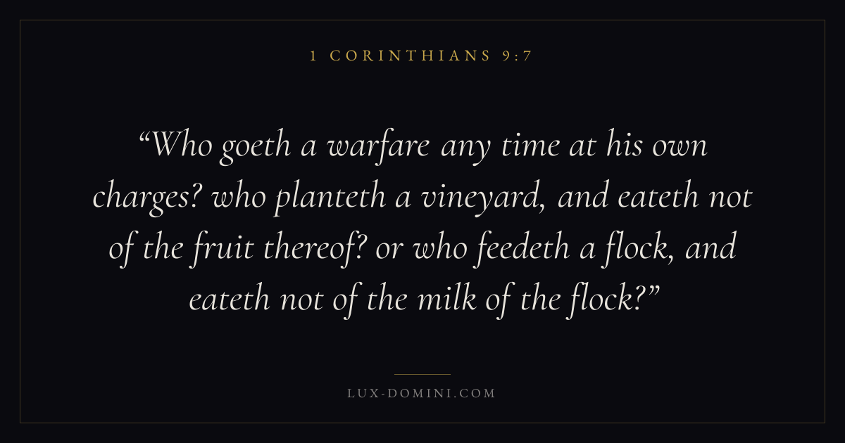Who goeth a warfare any time at his own charges? who planteth a vineyard, and eateth not of the fruit thereof? or who feedeth a flock, and eateth not of the milk of the flock?