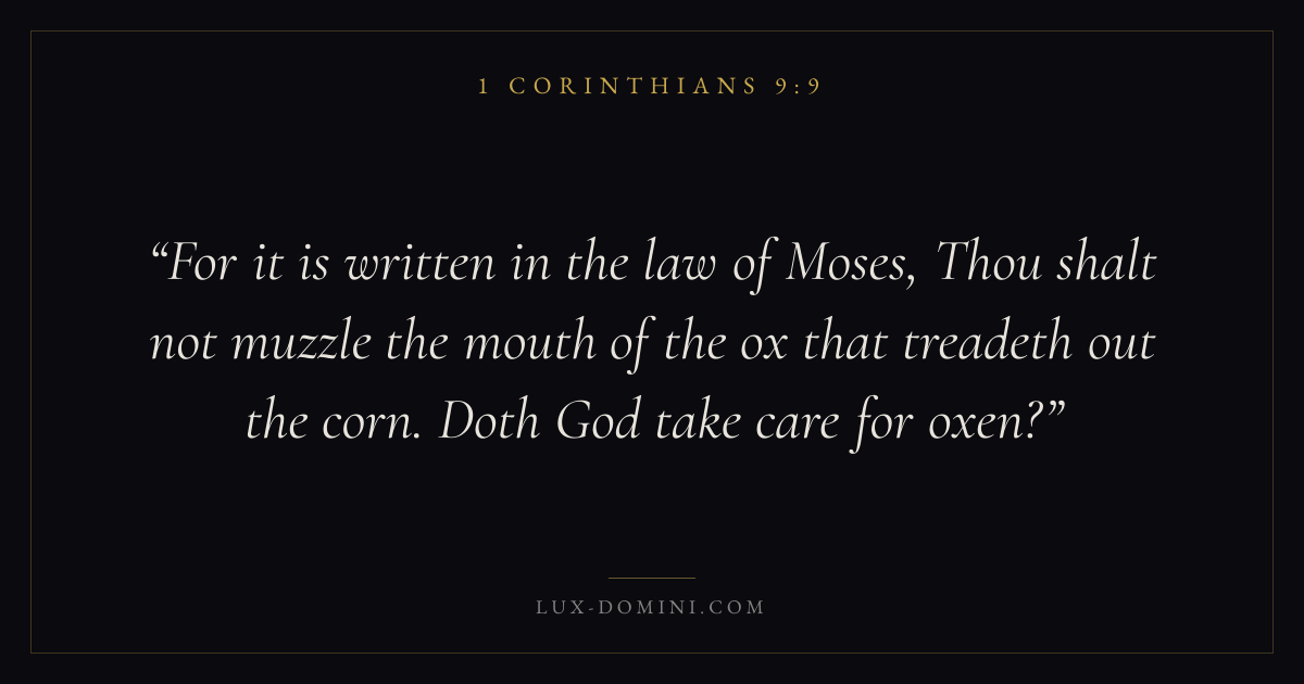 For it is written in the law of Moses, Thou shalt not muzzle the mouth of the ox that treadeth out the corn. Doth God take care for oxen?