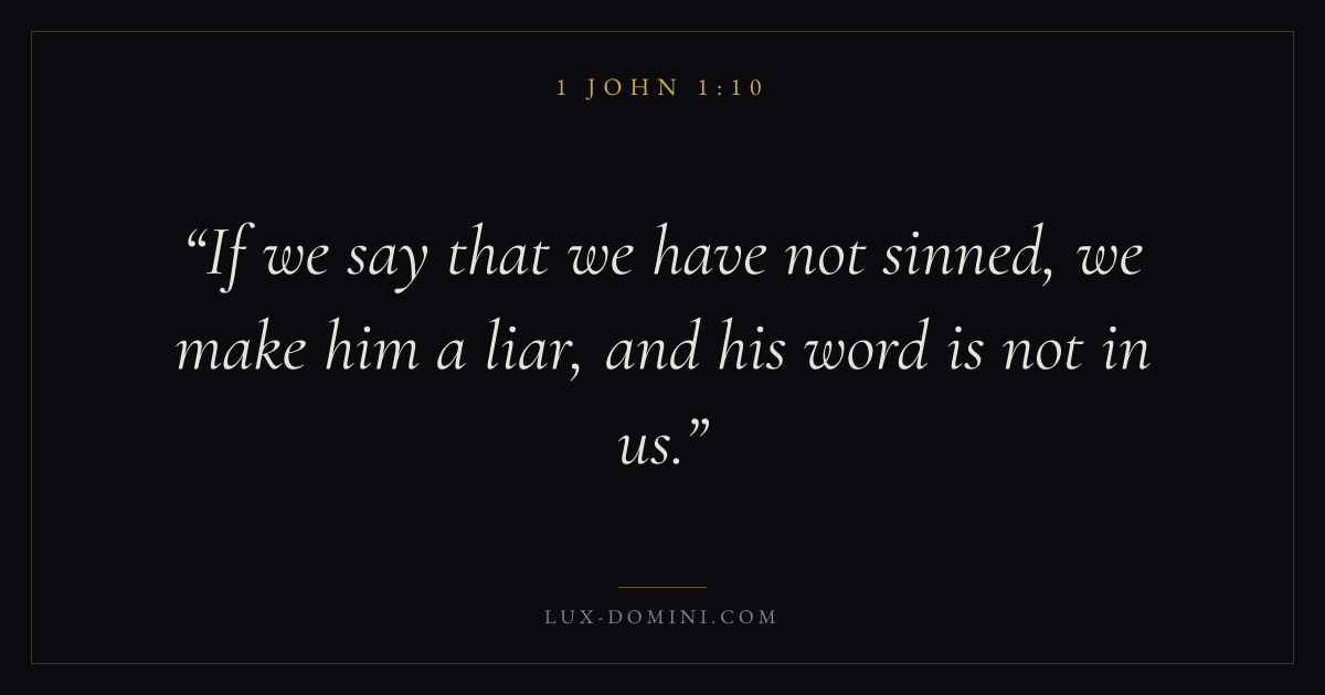Books / 1 John / Chapter 1 / Verse 10 ← 1 John 1:9 1 John 1:10 1 John 2:1 → If we say that we have not sinned, we make him a liar, and his word is not in us. Download verse card Share on Twitter Share on Facebook Pin it ✦ Key themes LoveTruthAssuranceIncarnation Read with 1 John 1:81 John 1:9John 3:161 Corinthians 13:4 Related topics Bible verses about loveBible verses about truth ✦ 1 John Chapter 1 verses V. 1 V. 2 V. 3 V. 4 V. 5 V. 6 V. 7 V. 8 V. 9 V. 10