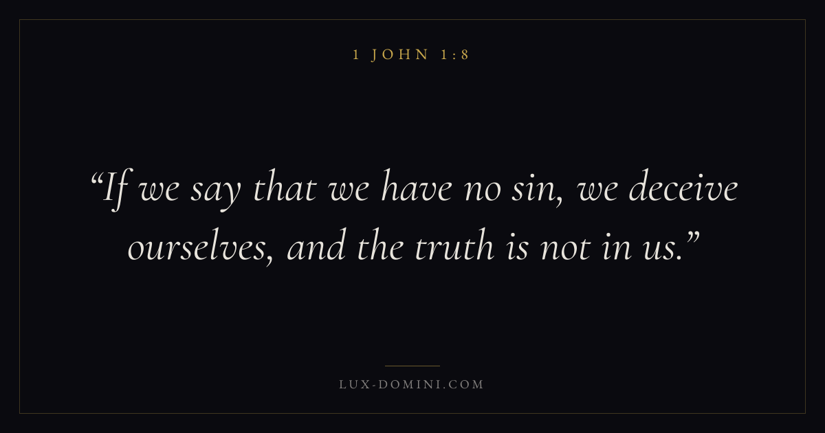 Books / 1 John / Chapter 1 / Verse 8 ← 1 John 1:7 1 John 1:8 1 John 1:9 → If we say that we have no sin, we deceive ourselves, and the truth is not in us. Download verse card Share on Twitter Share on Facebook Pin it ✦ Key themes LoveTruthAssuranceIncarnation Read with 1 John 1:91 John 1:10John 3:161 Corinthians 13:4 Related topics Bible verses about loveBible verses about truth ✦ 1 John Chapter 1 verses V. 1 V. 2 V. 3 V. 4 V. 5 V. 6 V. 7 V. 8 V. 9 V. 10