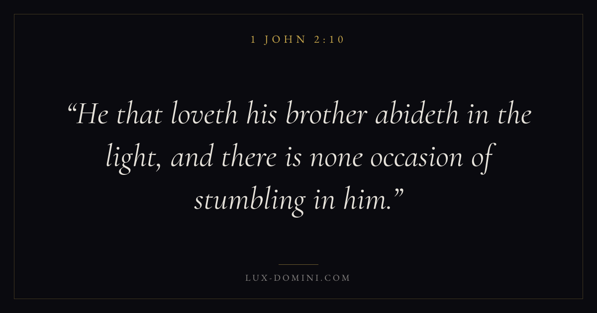 Books / 1 John / Chapter 2 / Verse 10 ← 1 John 2:9 1 John 2:10 1 John 2:11 → He that loveth his brother abideth in the light, and there is none occasion of stumbling in him. Download verse card Share on Twitter Share on Facebook Pin it ✦ Key themes LoveWisdomTruthAssurance Read with 1 John 2:11John 3:161 Corinthians 13:4Proverbs 1:7 Related topics Bible verses about loveBible verses about wisdomBible verses about truth ✦ 1 John Chapter 2 verses V. 1 V. 2 V. 3 V. 4 V. 5 V. 6 V. 7 V. 8 V. 9 V. 10 V. 11 V. 12 V. 13 V. 14 V. 15 V. 16 V. 17 V. 18 V. 19 V. 20 V. 21 V. 22 V. 23 V. 24 V. 25 V. 26 V. 27 V. 28 V. 29