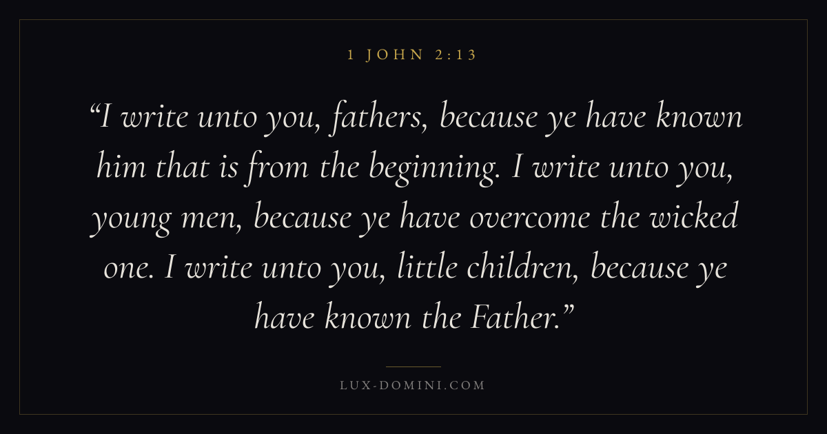 I write unto you, fathers, because ye have known him that is from the beginning. I write unto you, young men, because ye have overcome the wicked one. I write unto you, little children, because ye have known the Father.