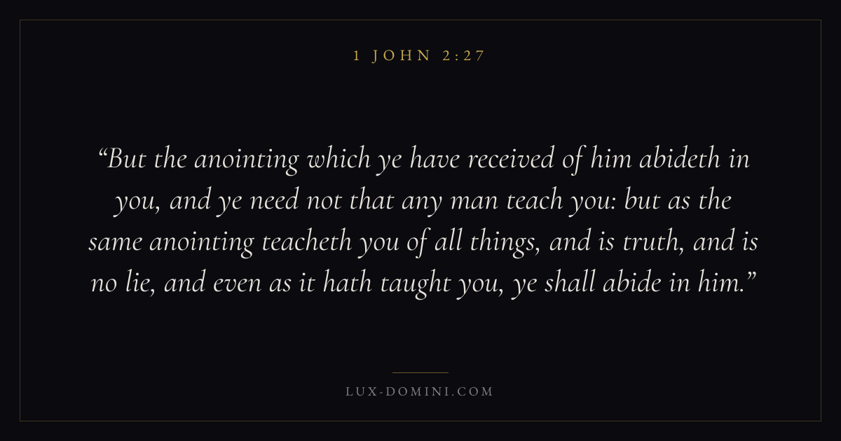 But the anointing which ye have received of him abideth in you, and ye need not that any man teach you: but as the same anointing teacheth you of all things, and is truth, and is no lie, and even as it hath taught you, ye shall abide in him.