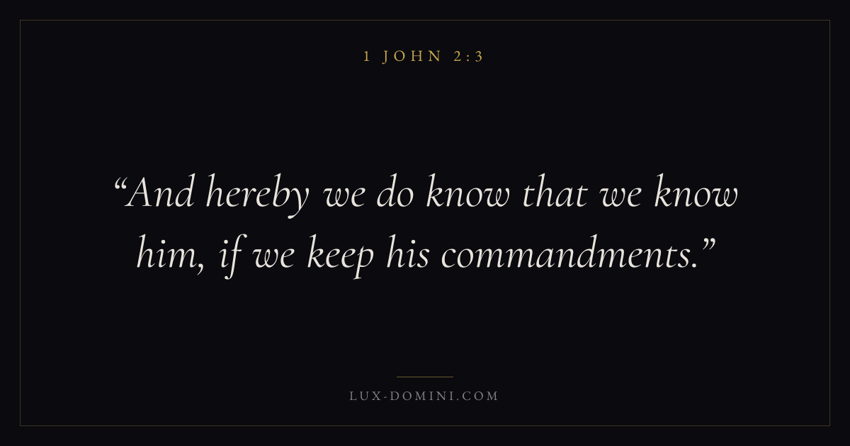 Books / 1 John / Chapter 2 / Verse 3 ← 1 John 2:2 1 John 2:3 1 John 2:4 → And hereby we do know that we know him, if we keep his commandments. Download verse card Share on Twitter Share on Facebook Pin it ✦ Key themes LoveWisdomTruthAssurance Read with 1 John 2:11 John 2:2John 3:161 Corinthians 13:4 Related topics Bible verses about loveBible verses about wisdomBible verses about truth ✦ 1 John Chapter 2 verses V. 1 V. 2 V. 3 V. 4 V. 5 V. 6 V. 7 V. 8 V. 9 V. 10 V. 11 V. 12 V. 13 V. 14 V. 15 V. 16 V. 17 V. 18 V. 19 V. 20 V. 21 V. 22 V. 23 V. 24 V. 25 V. 26 V. 27 V. 28 V. 29
