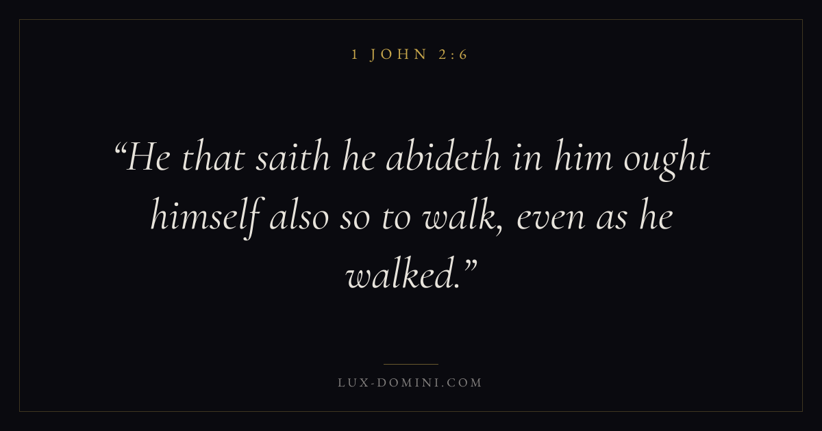 Books / 1 John / Chapter 2 / Verse 6 ← 1 John 2:5 1 John 2:6 1 John 2:7 → He that saith he abideth in him ought himself also so to walk, even as he walked. Download verse card Share on Twitter Share on Facebook Pin it ✦ Key themes LoveWisdomTruthAssurance Read with 1 John 2:41 John 2:5John 3:161 Corinthians 13:4 Related topics Bible verses about loveBible verses about wisdomBible verses about truth ✦ 1 John Chapter 2 verses V. 1 V. 2 V. 3 V. 4 V. 5 V. 6 V. 7 V. 8 V. 9 V. 10 V. 11 V. 12 V. 13 V. 14 V. 15 V. 16 V. 17 V. 18 V. 19 V. 20 V. 21 V. 22 V. 23 V. 24 V. 25 V. 26 V. 27 V. 28 V. 29