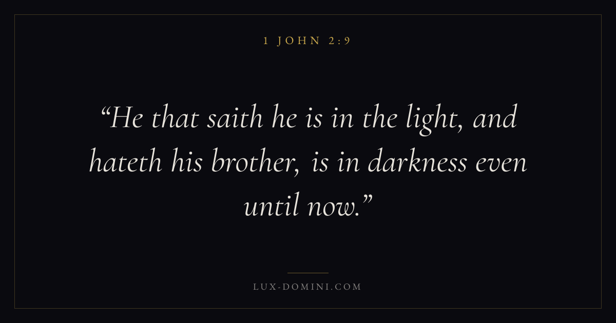 Books / 1 John / Chapter 2 / Verse 9 ← 1 John 2:8 1 John 2:9 1 John 2:10 → He that saith he is in the light, and hateth his brother, is in darkness even until now. Download verse card Share on Twitter Share on Facebook Pin it ✦ Key themes LoveWisdomTruthAssurance Read with 1 John 2:71 John 2:8John 3:161 Corinthians 13:4 Related topics Bible verses about loveBible verses about wisdomBible verses about truth ✦ 1 John Chapter 2 verses V. 1 V. 2 V. 3 V. 4 V. 5 V. 6 V. 7 V. 8 V. 9 V. 10 V. 11 V. 12 V. 13 V. 14 V. 15 V. 16 V. 17 V. 18 V. 19 V. 20 V. 21 V. 22 V. 23 V. 24 V. 25 V. 26 V. 27 V. 28 V. 29