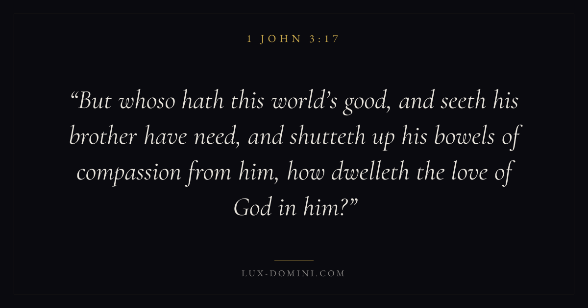 But whoso hath this world’s good, and seeth his brother have need, and shutteth up his bowels of compassion from him, how dwelleth the love of God in him?