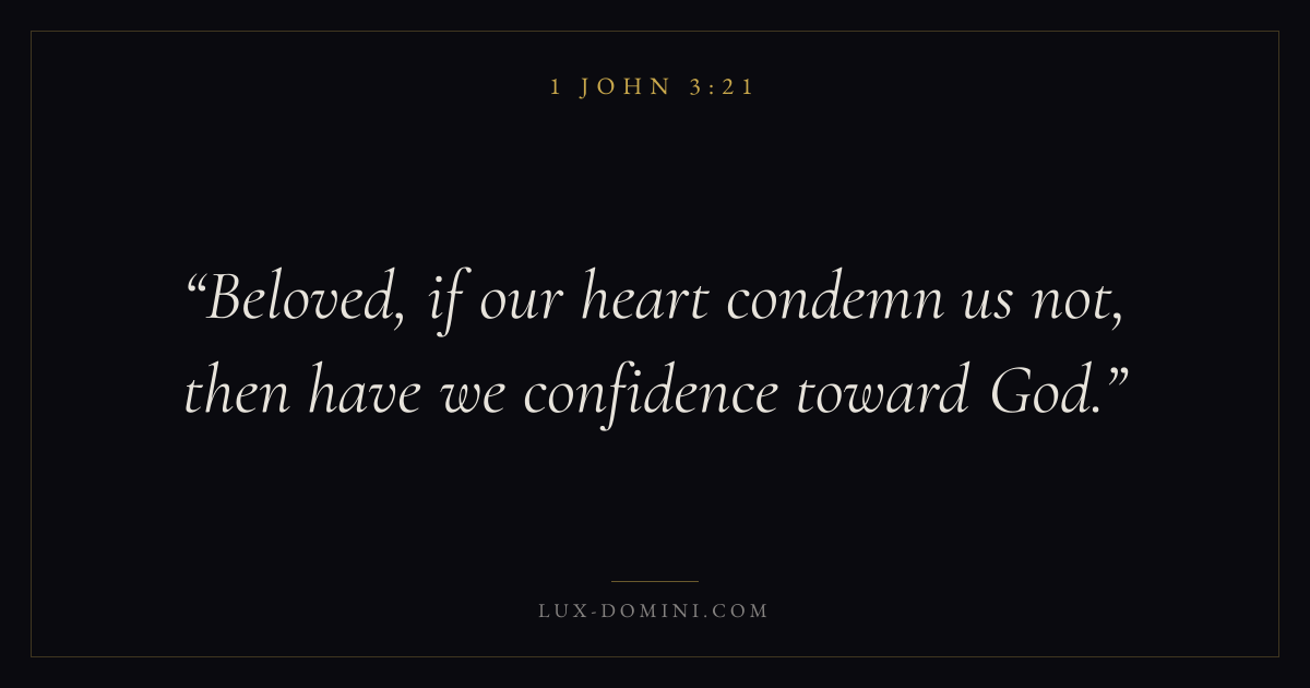 Books / 1 John / Chapter 3 / Verse 21 ← 1 John 3:20 1 John 3:21 1 John 3:22 → Beloved, if our heart condemn us not, then have we confidence toward God. Download verse card Share on Twitter Share on Facebook Pin it ✦ Key themes LoveSalvationTruthAssurance Read with 1 John 3:221 John 3:23John 3:161 Corinthians 13:4 Related topics Bible verses about loveBible verses about salvationBible verses about truth ✦ 1 John Chapter 3 verses V. 1 V. 2 V. 3 V. 4 V. 5 V. 6 V. 7 V. 8 V. 9 V. 10 V. 11 V. 12 V. 13 V. 14 V. 15 V. 16 V. 17 V. 18 V. 19 V. 20 V. 21 V. 22 V. 23 V. 24