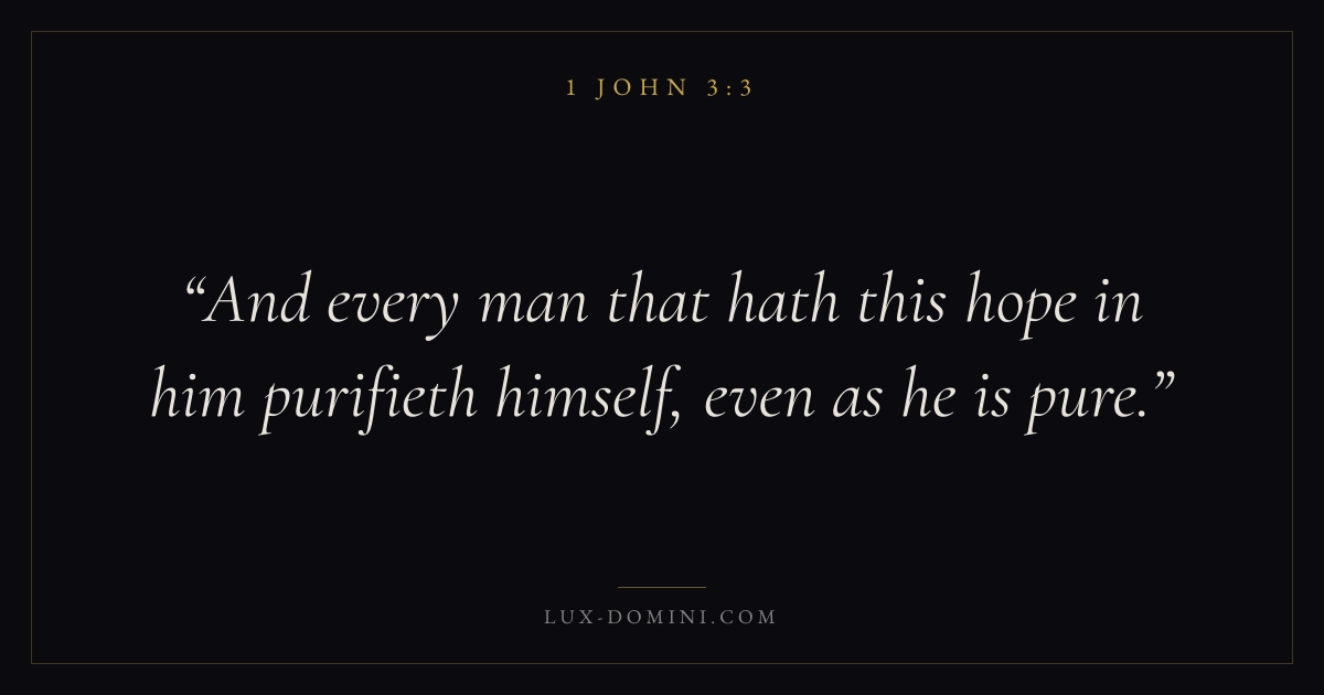 Books / 1 John / Chapter 3 / Verse 3 ← 1 John 3:2 1 John 3:3 1 John 3:4 → And every man that hath this hope in him purifieth himself, even as he is pure. Download verse card Share on Twitter Share on Facebook Pin it ✦ Key themes LoveHopeTruthAssurance Read with 1 John 3:11 John 3:2John 3:161 Corinthians 13:4 Related topics Bible verses about loveBible verses about hopeBible verses about truth ✦ 1 John Chapter 3 verses V. 1 V. 2 V. 3 V. 4 V. 5 V. 6 V. 7 V. 8 V. 9 V. 10 V. 11 V. 12 V. 13 V. 14 V. 15 V. 16 V. 17 V. 18 V. 19 V. 20 V. 21 V. 22 V. 23 V. 24