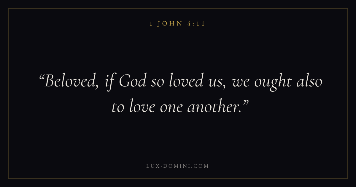 Books / 1 John / Chapter 4 / Verse 11 ← 1 John 4:10 1 John 4:11 1 John 4:12 → Beloved, if God so loved us, we ought also to love one another. Download verse card Share on Twitter Share on Facebook Pin it ✦ Key themes LoveWisdomTruthAssurance Read with 1 John 4:12John 3:161 Corinthians 13:4Proverbs 1:7 Related topics Bible verses about loveBible verses about wisdomBible verses about truth ✦ 1 John Chapter 4 verses V. 1 V. 2 V. 3 V. 4 V. 5 V. 6 V. 7 V. 8 V. 9 V. 10 V. 11 V. 12 V. 13 V. 14 V. 15 V. 16 V. 17 V. 18 V. 19 V. 20 V. 21