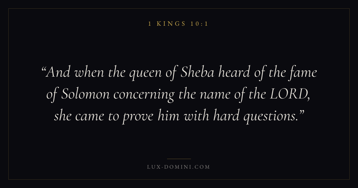And when the queen of Sheba heard of the fame of Solomon concerning the name of the LORD, she came to prove him with hard questions.