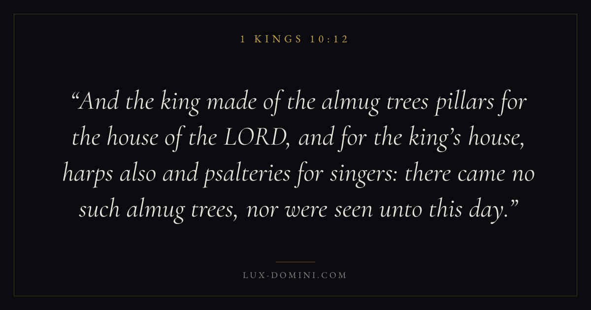 And the king made of the almug trees pillars for the house of the LORD, and for the king’s house, harps also and psalteries for singers: there came no such almug trees, nor were seen unto this day.