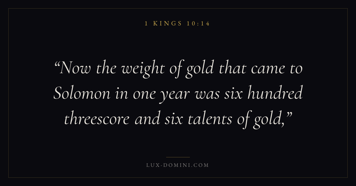 Now the weight of gold that came to Solomon in one year was six hundred threescore and six talents of gold,