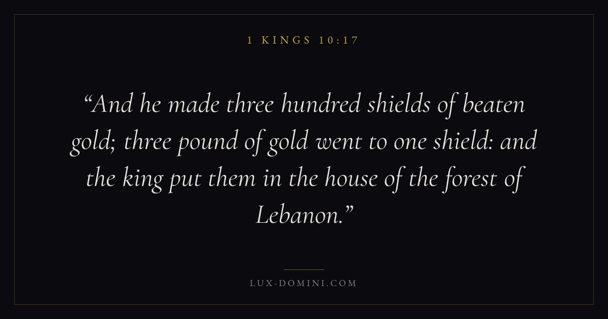 And he made three hundred shields of beaten gold; three pound of gold went to one shield: and the king put them in the house of the forest of Lebanon.