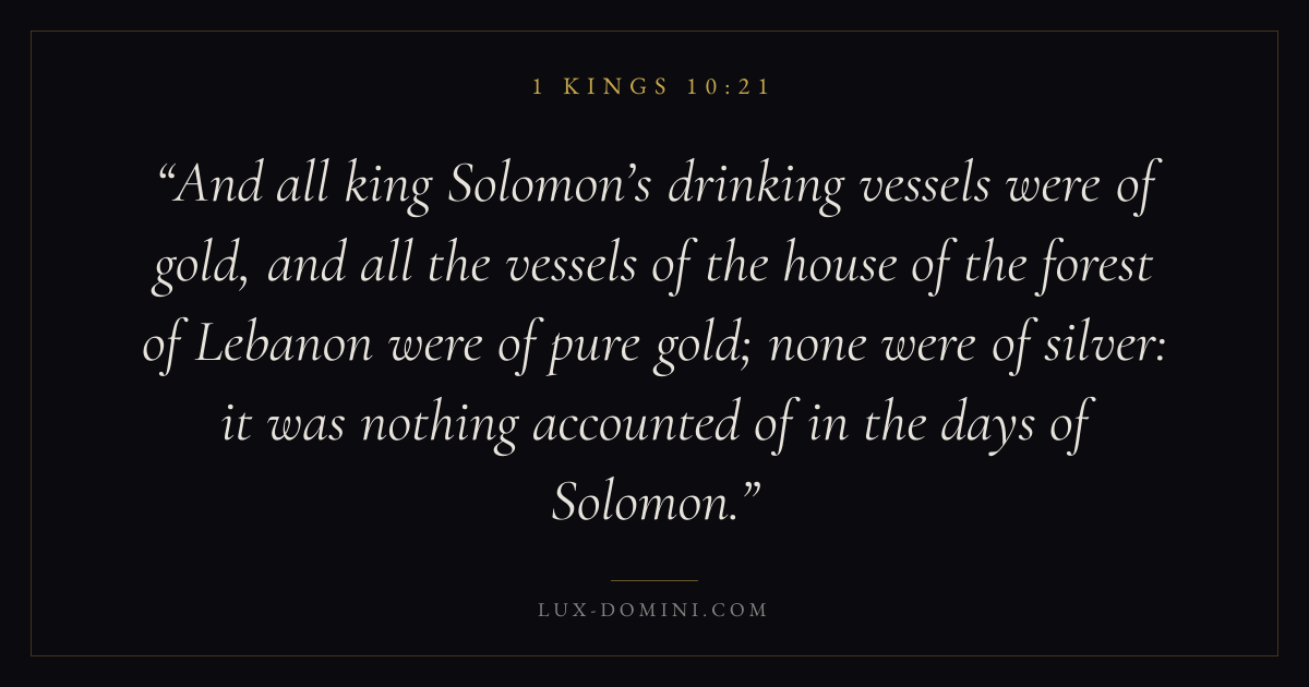 And all king Solomon’s drinking vessels were of gold, and all the vessels of the house of the forest of Lebanon were of pure gold; none were of silver: it was nothing accounted of in the days of Solomon.