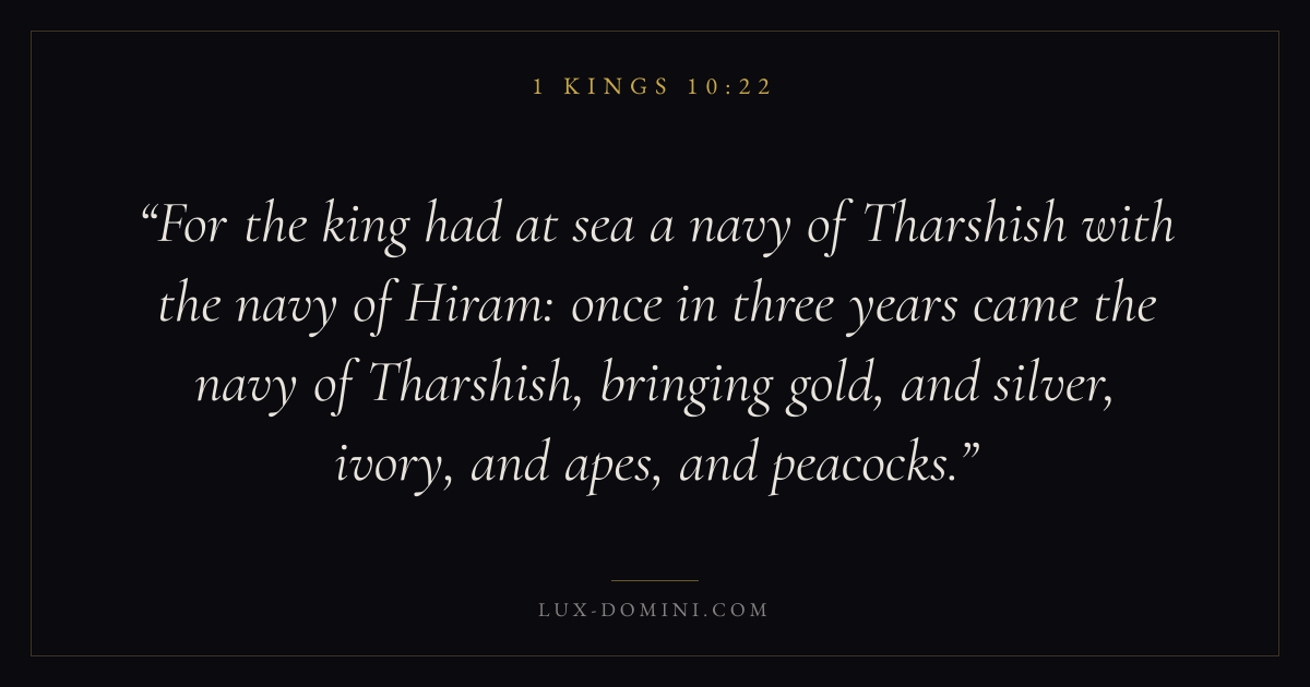 For the king had at sea a navy of Tharshish with the navy of Hiram: once in three years came the navy of Tharshish, bringing gold, and silver, ivory, and apes, and peacocks.