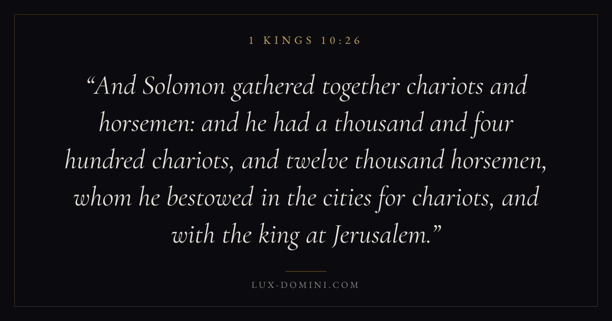 And Solomon gathered together chariots and horsemen: and he had a thousand and four hundred chariots, and twelve thousand horsemen, whom he bestowed in the cities for chariots, and with the king at Jerusalem.