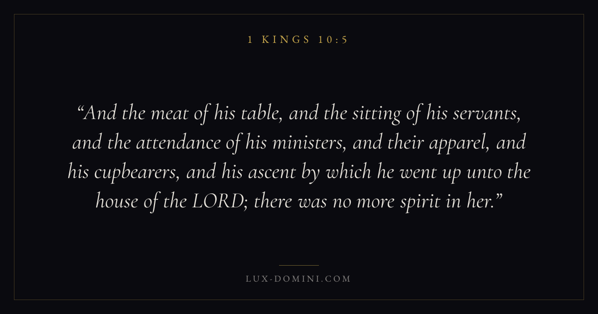 And the meat of his table, and the sitting of his servants, and the attendance of his ministers, and their apparel, and his cupbearers, and his ascent by which he went up unto the house of the LORD; there was no more spirit in her.