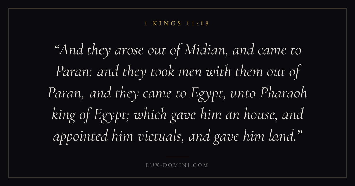 And they arose out of Midian, and came to Paran: and they took men with them out of Paran, and they came to Egypt, unto Pharaoh king of Egypt; which gave him an house, and appointed him victuals, and gave him land.