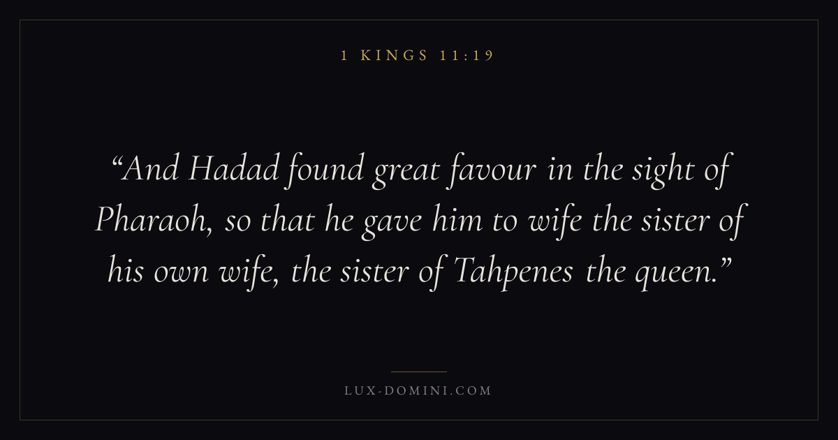 And Hadad found great favour in the sight of Pharaoh, so that he gave him to wife the sister of his own wife, the sister of Tahpenes the queen.