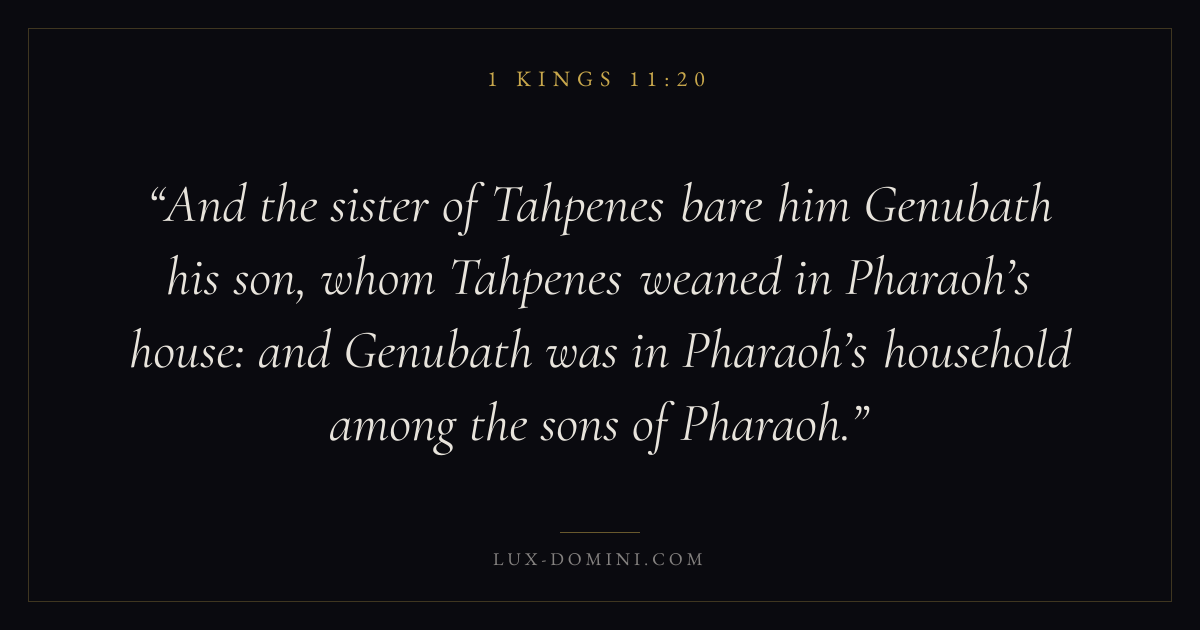 And the sister of Tahpenes bare him Genubath his son, whom Tahpenes weaned in Pharaoh’s house: and Genubath was in Pharaoh’s household among the sons of Pharaoh.