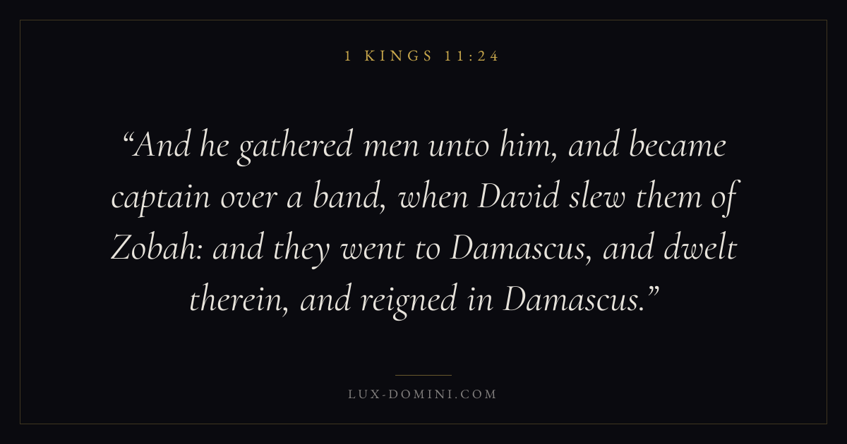 And he gathered men unto him, and became captain over a band, when David slew them of Zobah: and they went to Damascus, and dwelt therein, and reigned in Damascus.