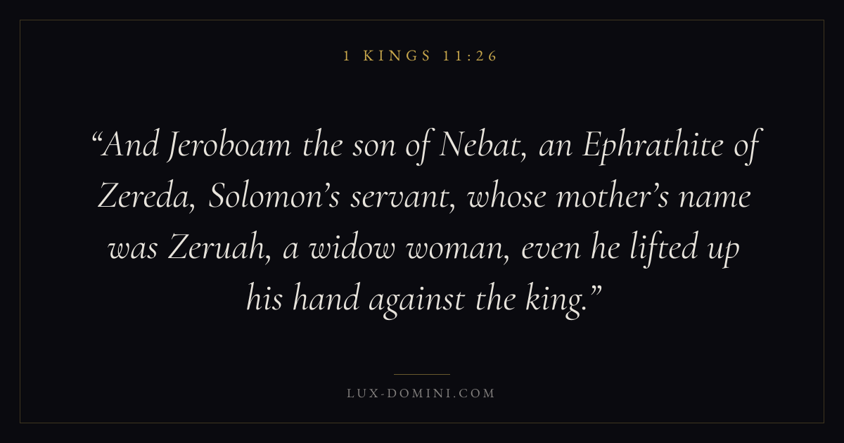 And Jeroboam the son of Nebat, an Ephrathite of Zereda, Solomon’s servant, whose mother’s name was Zeruah, a widow woman, even he lifted up his hand against the king.