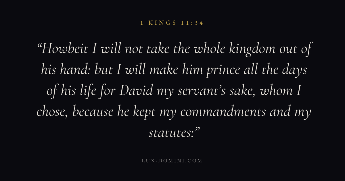 Howbeit I will not take the whole kingdom out of his hand: but I will make him prince all the days of his life for David my servant’s sake, whom I chose, because he kept my commandments and my statutes:
