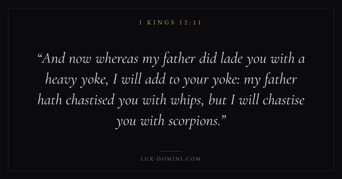 And now whereas my father did lade you with a heavy yoke, I will add to your yoke: my father hath chastised you with whips, but I will chastise you with scorpions.