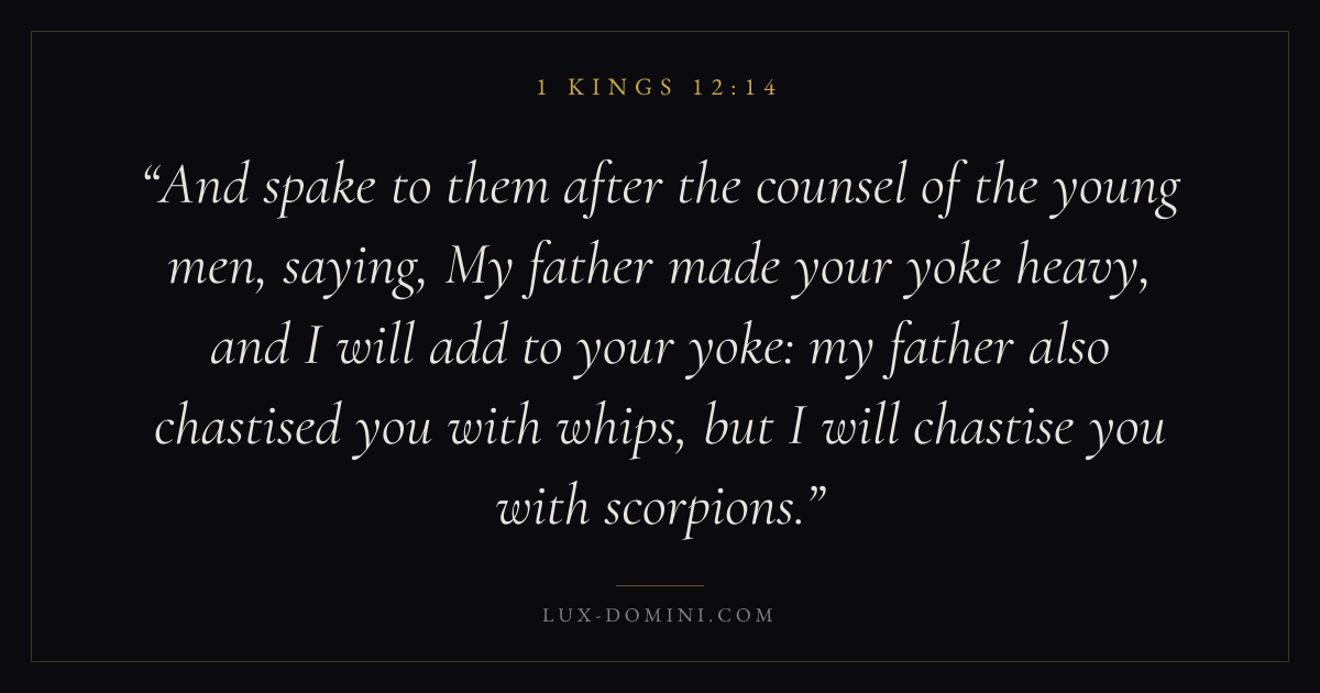 And spake to them after the counsel of the young men, saying, My father made your yoke heavy, and I will add to your yoke: my father also chastised you with whips, but I will chastise you with scorpions.