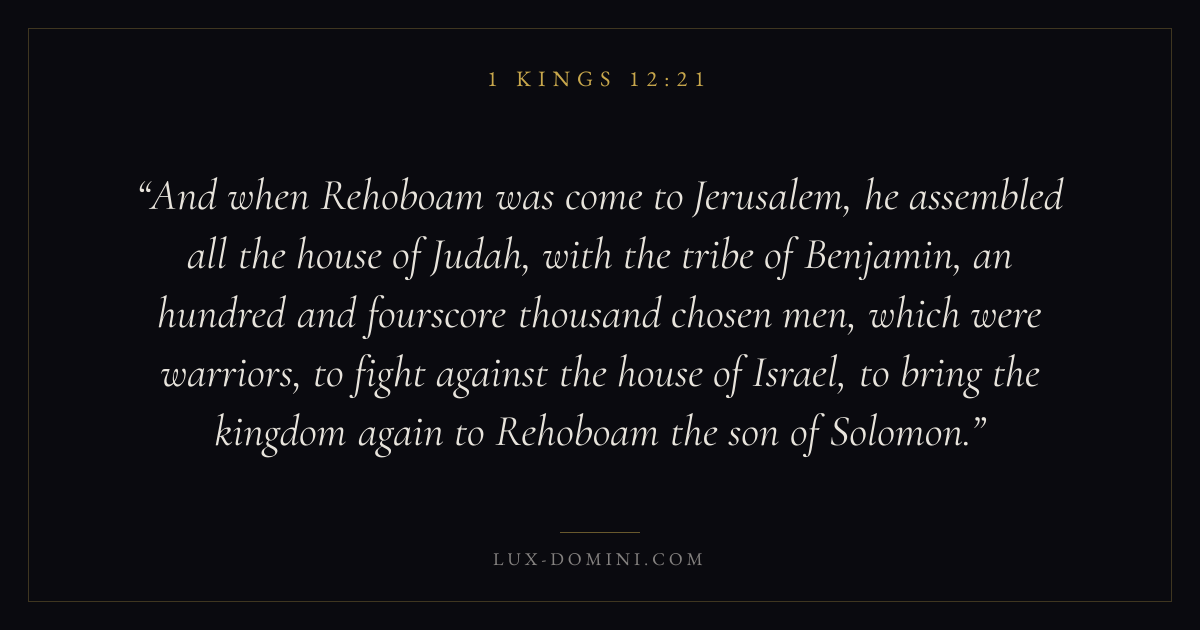 And when Rehoboam was come to Jerusalem, he assembled all the house of Judah, with the tribe of Benjamin, an hundred and fourscore thousand chosen men, which were warriors, to fight against the house of Israel, to bring the kingdom again to Rehoboam the son of Solomon.