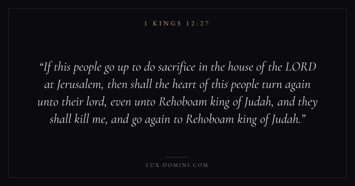 If this people go up to do sacrifice in the house of the LORD at Jerusalem, then shall the heart of this people turn again unto their lord, even unto Rehoboam king of Judah, and they shall kill me, and go again to Rehoboam king of Judah.