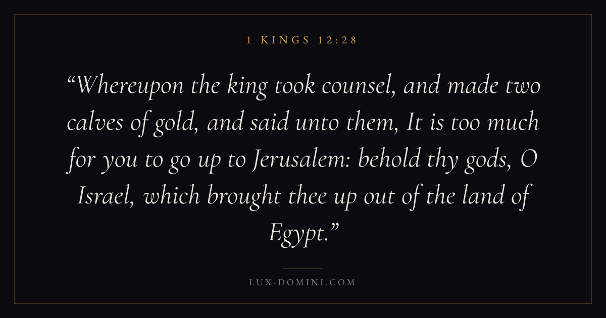 Whereupon the king took counsel, and made two calves of gold, and said unto them, It is too much for you to go up to Jerusalem: behold thy gods, O Israel, which brought thee up out of the land of Egypt.