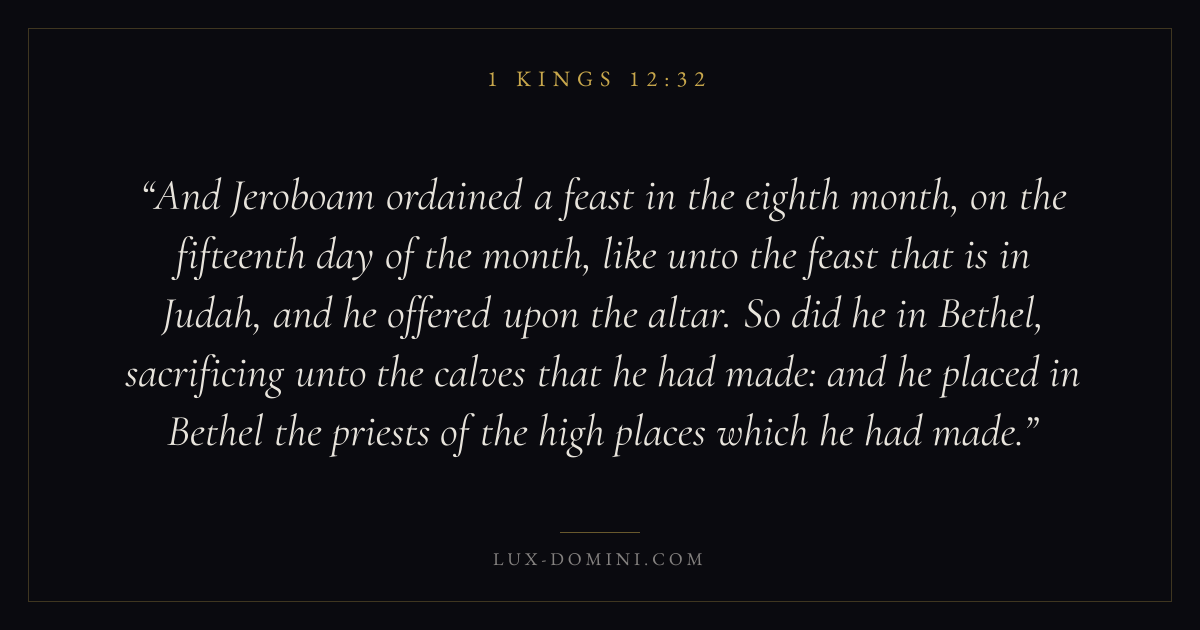 And Jeroboam ordained a feast in the eighth month, on the fifteenth day of the month, like unto the feast that is in Judah, and he offered upon the altar. So did he in Bethel, sacrificing unto the calves that he had made: and he placed in Bethel the priests of the high places which he had made.
