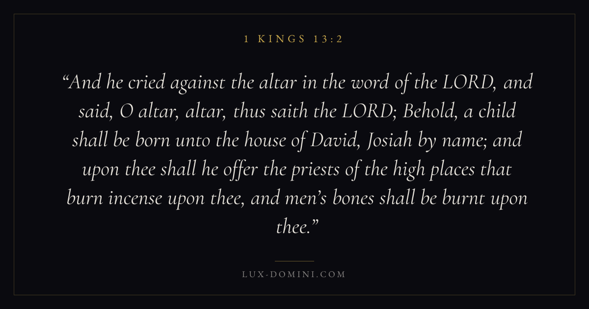 And he cried against the altar in the word of the LORD, and said, O altar, altar, thus saith the LORD; Behold, a child shall be born unto the house of David, Josiah by name; and upon thee shall he offer the priests of the high places that burn incense upon thee, and men’s bones shall be burnt upon thee.