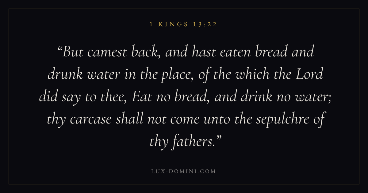 But camest back, and hast eaten bread and drunk water in the place, of the which the Lord did say to thee, Eat no bread, and drink no water; thy carcase shall not come unto the sepulchre of thy fathers.