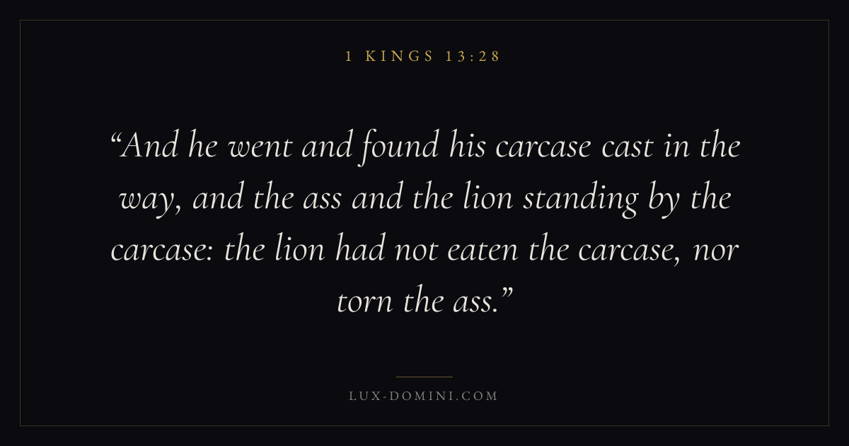 And he went and found his carcase cast in the way, and the ass and the lion standing by the carcase: the lion had not eaten the carcase, nor torn the ass.