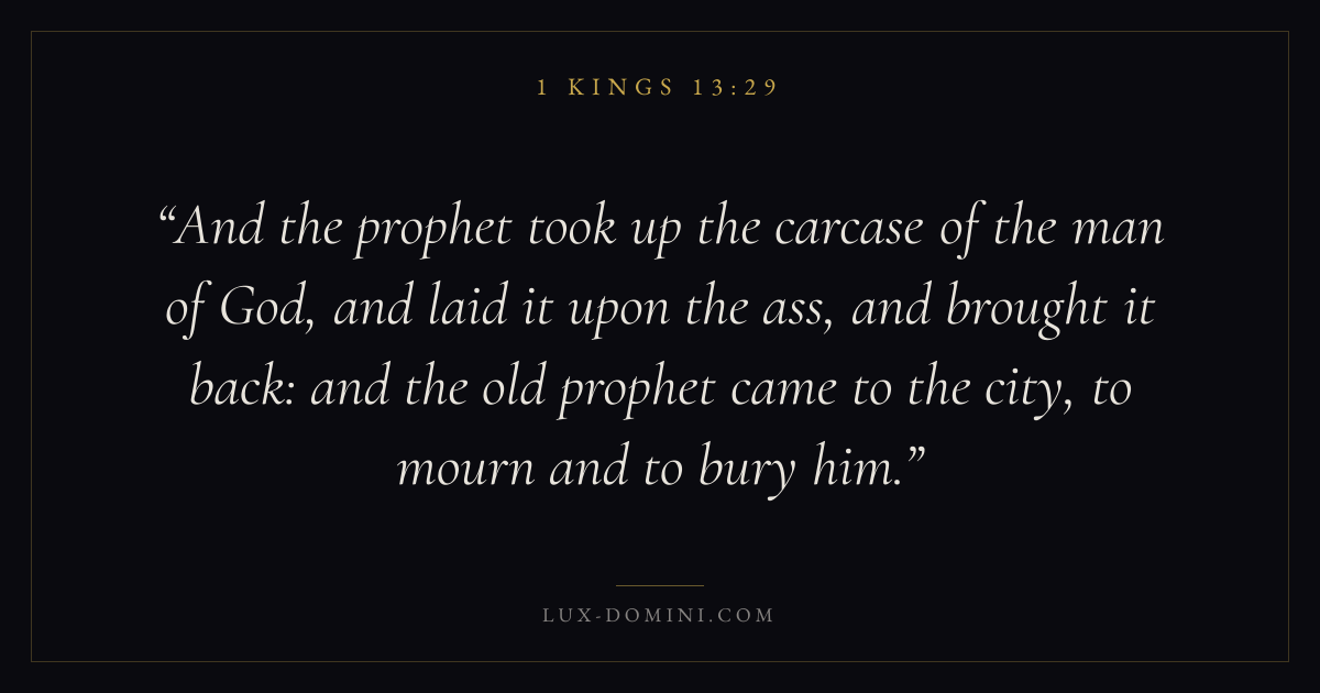 And the prophet took up the carcase of the man of God, and laid it upon the ass, and brought it back: and the old prophet came to the city, to mourn and to bury him.