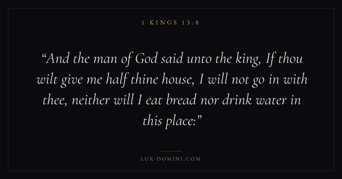 And the man of God said unto the king, If thou wilt give me half thine house, I will not go in with thee, neither will I eat bread nor drink water in this place: