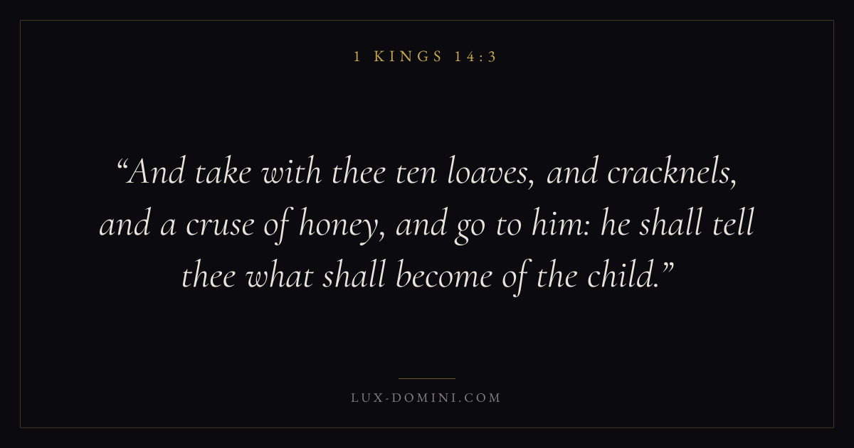 And take with thee ten loaves, and cracknels, and a cruse of honey, and go to him: he shall tell thee what shall become of the child.